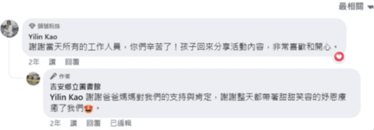 吉安鄉立圖書館致力於推廣閱讀,盡我們全力策劃活動,自己找老師、製作海報,樣樣自己來,很多活動也都是我們的第一次,我們與大家一起學習、一起進步,每一場活動結束後的體力耗盡,為的就是與大家一起經歷的過程及美好的成果,希望可以以各種形式、樣貌、多元化的活動結合閱讀,使閱讀無所不在,更希望可以帶動青少年學子們走進館閱讀、享受閱讀。