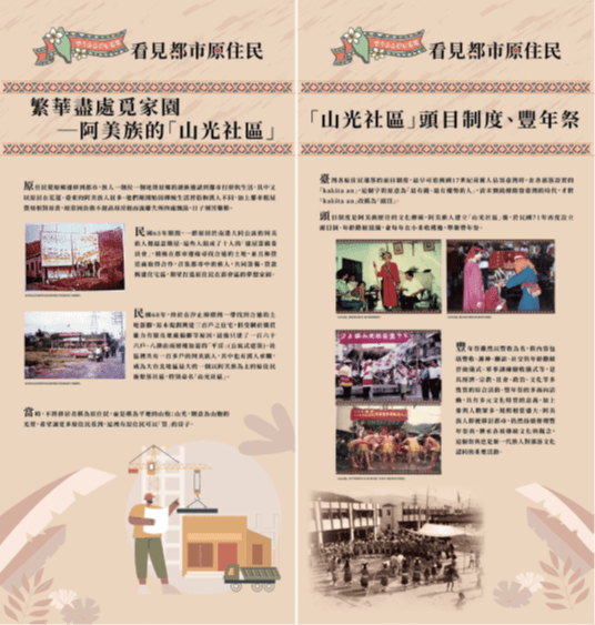 梳理「山光社區」歷史背景與事件經過,製作文案與大幅海報,再將蒐集到的珍貴老照片串聯整理影像放映,聚焦阿美族從花東到臺北都會區流浪的歷史悲歌,邀民眾一起踏上原路,認識並思考都市原住民怎麼來又走向哪。