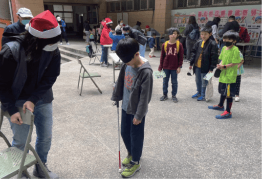 3. 視障「行」體驗:參與者戴上眼罩並使用白手杖,模擬在街道上行走的挑戰,同時學習如何幫助需要協助的視障者。