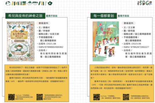 包括建置永續評選圖書流程、實施圖書評選、推廣入選圖書等。經專家評審,遴選出120種融合環境、社會、經濟面向的永續發展書籍,並發表《永續發展圖書資料閱讀手冊》。同時於全臺5縣市及國臺圖設置永續閱讀角示範點,辦理書展、說故事等活動,更與聾人團體合作,提供手語、同步聽打等共融式體驗,守護閱讀平權。