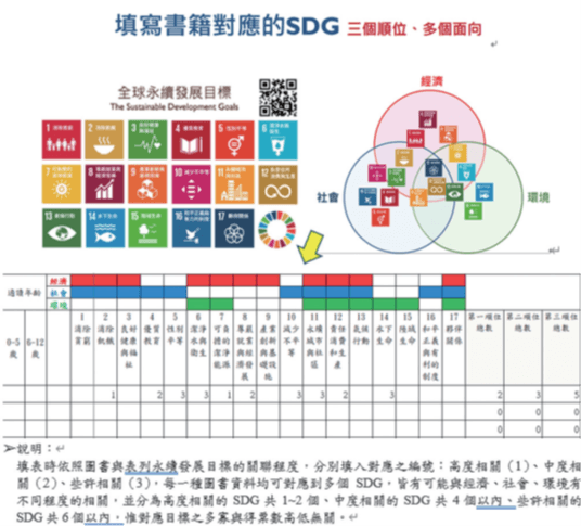 於111年6月啟動,邀請各領域專家組成諮詢小組擬訂「永續發展教育圖書資料選送辦法」,同年8月,由五位學者專家組成評選小組,為確保專業性與公正性,諮詢委員會與圖書資料評選小組成員不重複。為幫助出版社選送符合永續發展目標的圖書,運用葉欣誠教授團隊的研究成果「修改使用達菲法(Delphi Method)發展永續繪本選書系統」作為評選分類統計的基礎模式(如下所示)。