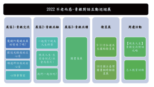 (三)111年10月,與弘道老人福利基金會合辦「不老而惑 青銀對話互動展」主題書展暨系列活動,另延伸串聯縣市公共圖書館辦理衛星展。