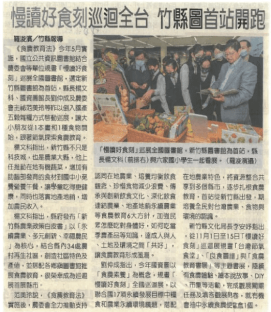 對食品安全發展有高度需求的臺灣乃至於全世界,食農教育是相當重要且受重視的議題。「慢讀好食刻」全國公共圖書館巡迴展由國立公共資訊圖書館攜手農業部、飲食文化教育基金會、觀樹教育基金會共同推出,且容易移展方式的展品與陳列,以巡迴展模式成功將食農教育帶入全國各地圖書館,將「飲食素養」與「農業素養」結合為「食農素養」。透過互動式展覽與「做中學」的體驗學習策略,多元的展覽主題如「臺灣節氣食堂」、「良食圖譜」和「食農教育書展」,讓讀者透過精選的150冊主題書籍,深刻理解糧食和農業的永續議題。整體而言,此次全國性推廣活動不僅在食農教育領域中展現了高度影響力,亦成功將知識普及至廣大民眾,成效顯著,意義深遠。