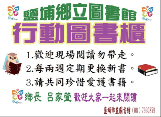 隨著科技電子化之趨勢,大人或孩童使用3C產品都是無法避免的,圖書館推動行動圖書櫃,提倡「幸福鹽埔在地生活書香」,讓鄉民更方便閱讀。