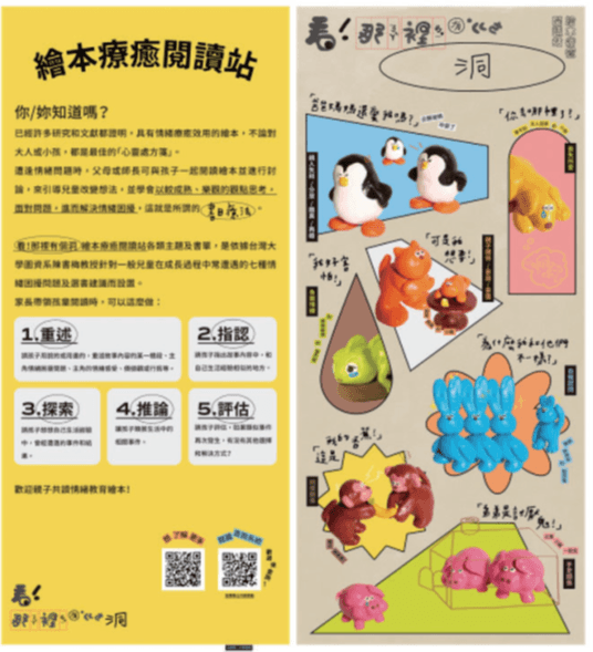 有人說「幸運的人用童年治癒一生,不幸的人用一生治癒童年」,童年時期是每個人一生中相當重要的時刻,將會對日後產生不小的影響,因此本次繪本書展以0-6歲學齡前兒童為對象,參考國內書目療法專家的建議書單,並設計大型直立式看板及情境小卡,供家長參考利用,依據孩童實際遭遇狀況,翻閱合適的圖書,走進書中世界,減少負面情緒的影響。