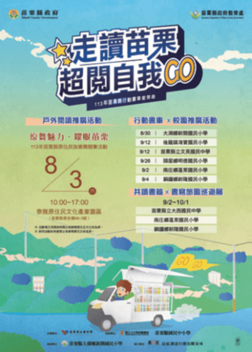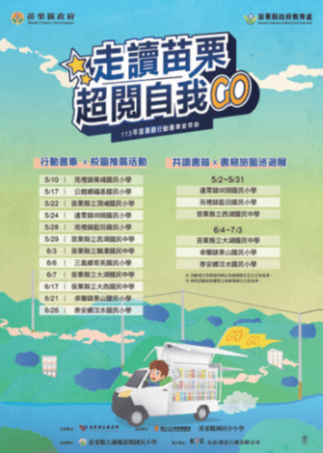 今(113) 年更跨域與國立公共資訊圖書館合作辦理「走讀苗栗 超閱自我- 113年苗栗縣行動書車愛閱下鄉趣GO ! GO ! GO !」活動,將閱讀資源宅速配到偏鄉。結合公私部門,透過受贈的行動書車及講師與學習單閱讀設計融入活潑、有趣、生動的元素,結合一般與APP 圖書借閱、繪本導讀DIY、班級閱讀角、共讀書箱、行動書車閱讀推廣等新興型態的配套活動,擴展生活化、多元化、藝術化的學習,深耕閱讀種子於偏鄉日常生活之中。