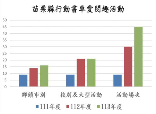 (五)113 年賡續由苗栗縣政府於4月26日召開說明會議,排定含三義鄉育英國小、公館鄉福基國小、南庄鄉蓬萊國小等偏鄉中小學,18鄉鎮市計42場次中小學圖書館閱讀活動、行動書車、班級共讀等,以供瞭解不同文化及文學發展。