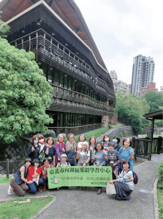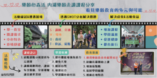 (五) 內湖樂齡中心在112年獲得第6屆教育部樂齡奉獻獎的肯定,獲獎原因之一就是走讀課程具創新價值,突破限制,給予學員不同於室內上課的體驗。