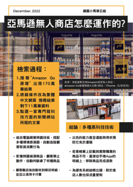 期末的海報發表,讓學生學習口頭簡報技巧及能力,並練習如何提供別人正面的回饋。每位學生必須提出一個問題(不可以是事實型問題),展示提出檢索策略、檢索結果,根據蒐集的資料提出結論,發表時間共90秒,並需穿著正裝。